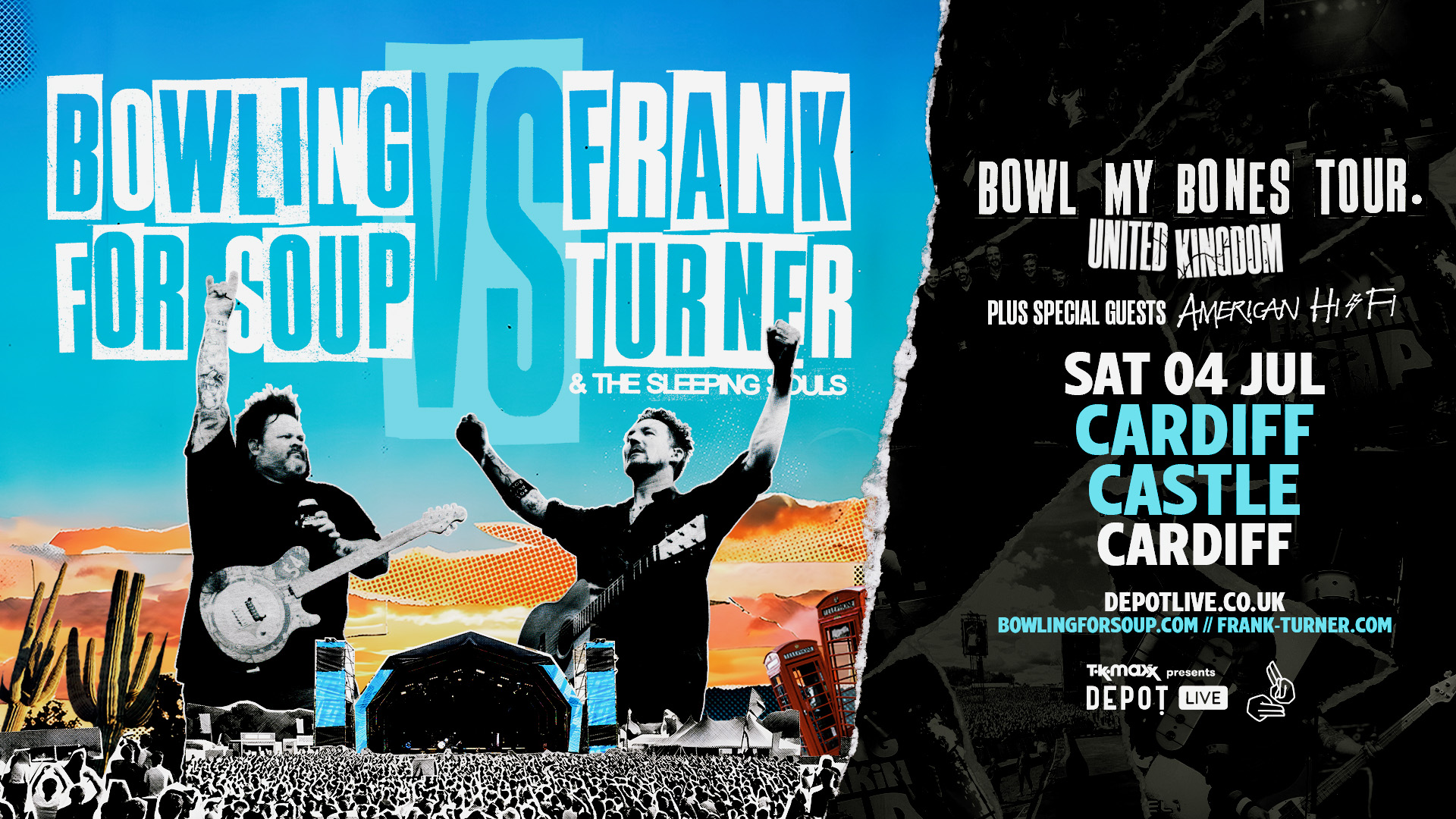 Texan pop-punk icons Bowling For Soup and folk-punk powerhouse Frank Turner & The Sleeping Souls team up for the first time ever, bringing their Bowl My Bones UK tour to TK Maxx presents DEPOT Live at Cardiff Castle.